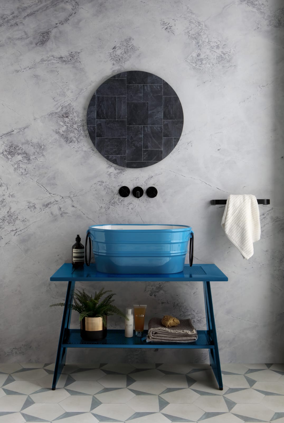 Komposition in cyanfarbener Wanne auf cyanfarbener Staffelei