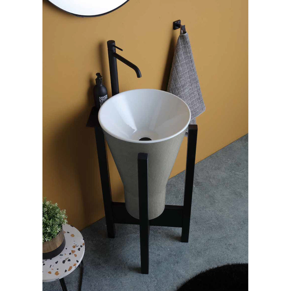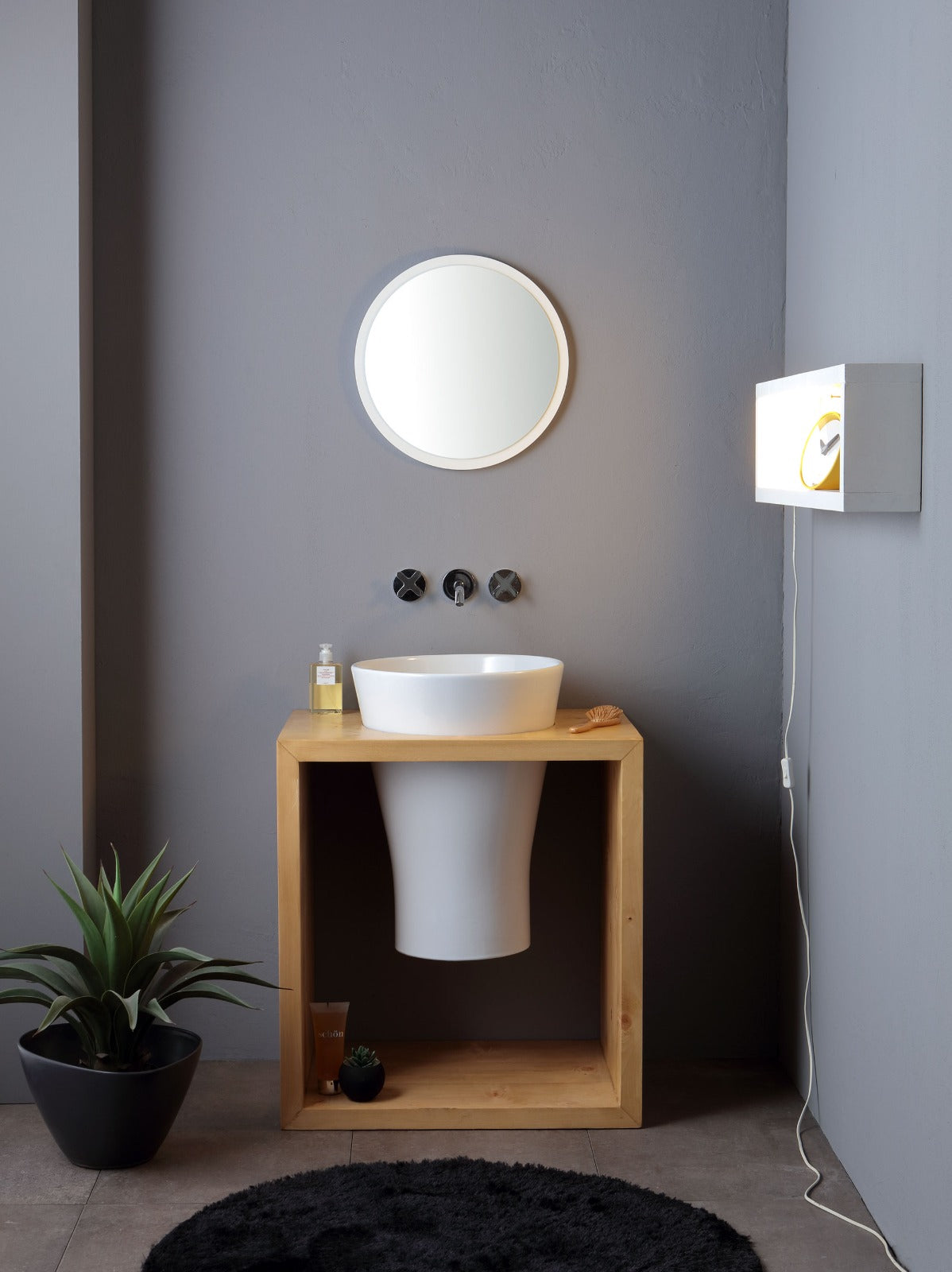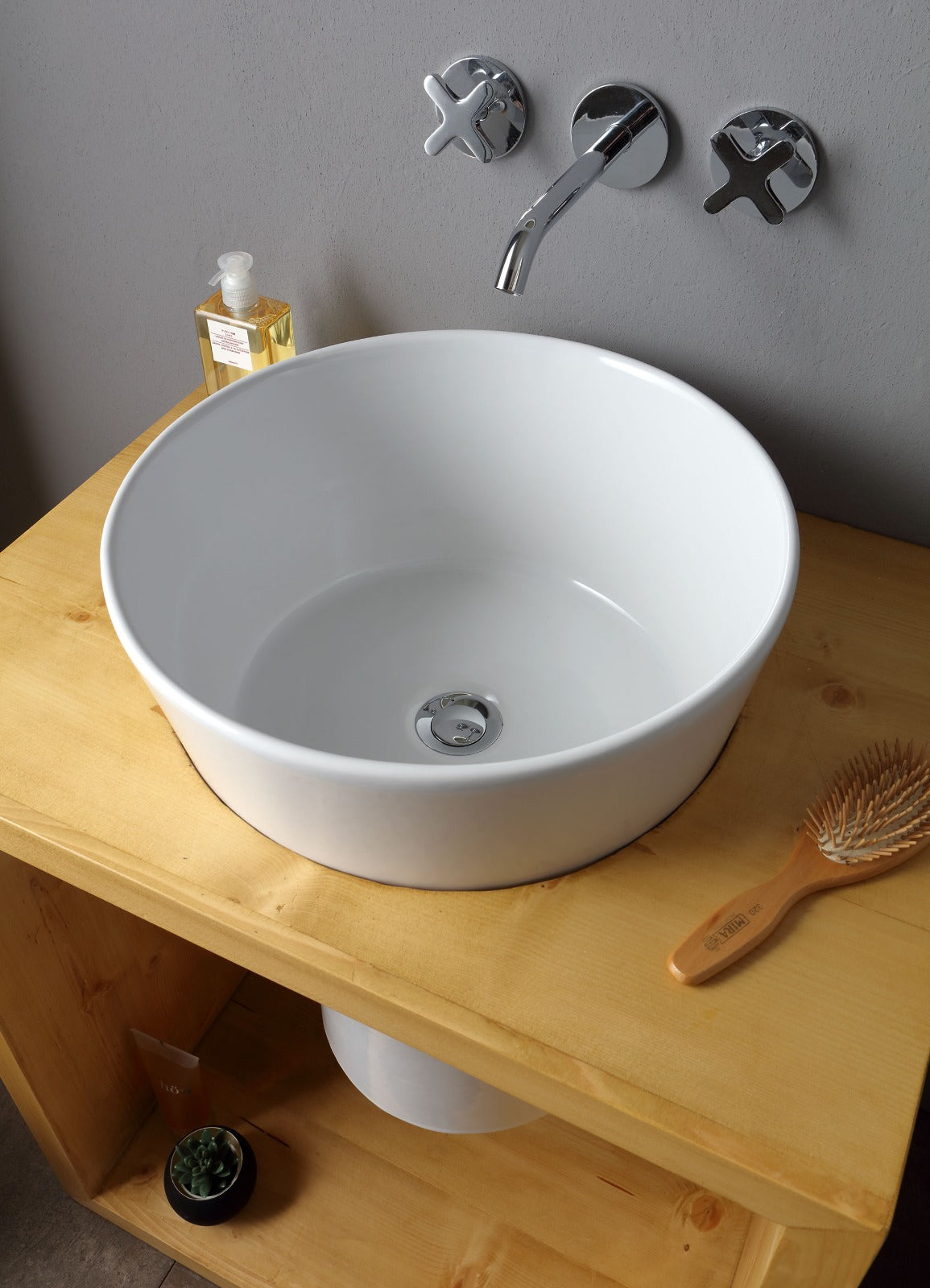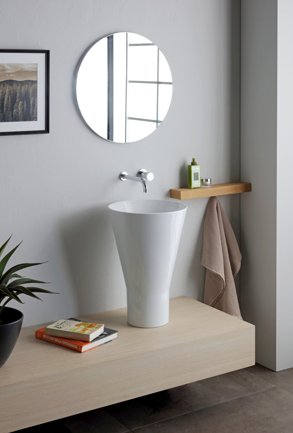 Lavabo d'appoggio o centro stanza in ceramica, diametro esterno cm 38 x altezza cm 60. Piletta clip e clap e copripiletta in ceramica esclusi. Struttura esclusa.